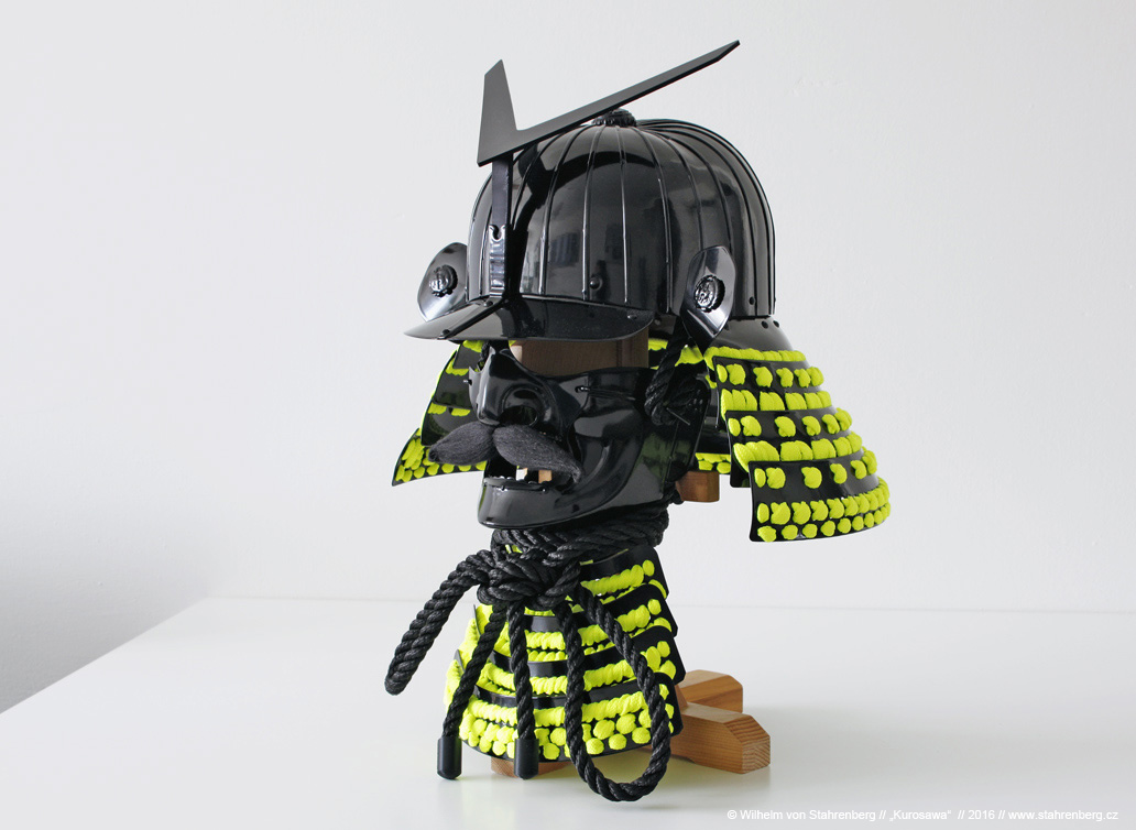 Objekt „Kurosawa“ z roku 2016; úprava repliky samurajské helmy (Masamune Date); prášková barva, 3D tisk z PLA, barva ve spreji, tkaničky do bot, provaz, tvarovatelný žertovný knír. Rozměry cca 36 x 36 x 47 cm. |