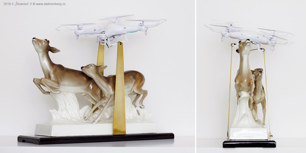 Objekt „Štvanice“ z roku 2018; kombinace poškozené porcelánové sošky zvířat (autor zřejmě "Wanke", přibližně 20. léta 20. století), kvadrokoptéry Syma, vyrobeného podstavce (lakované dřevo), plechového držáku (laserem řezaná nerez ocel, prášková barva), plastových, stahovacích pásků a nerezových vrutů, připravených pro připevnění držáku k podstavci (zatím se mi nechtělo ten lakovaný povrch podstavce narušovat). Rozměry cca 52 x 32 x 37 cm. |