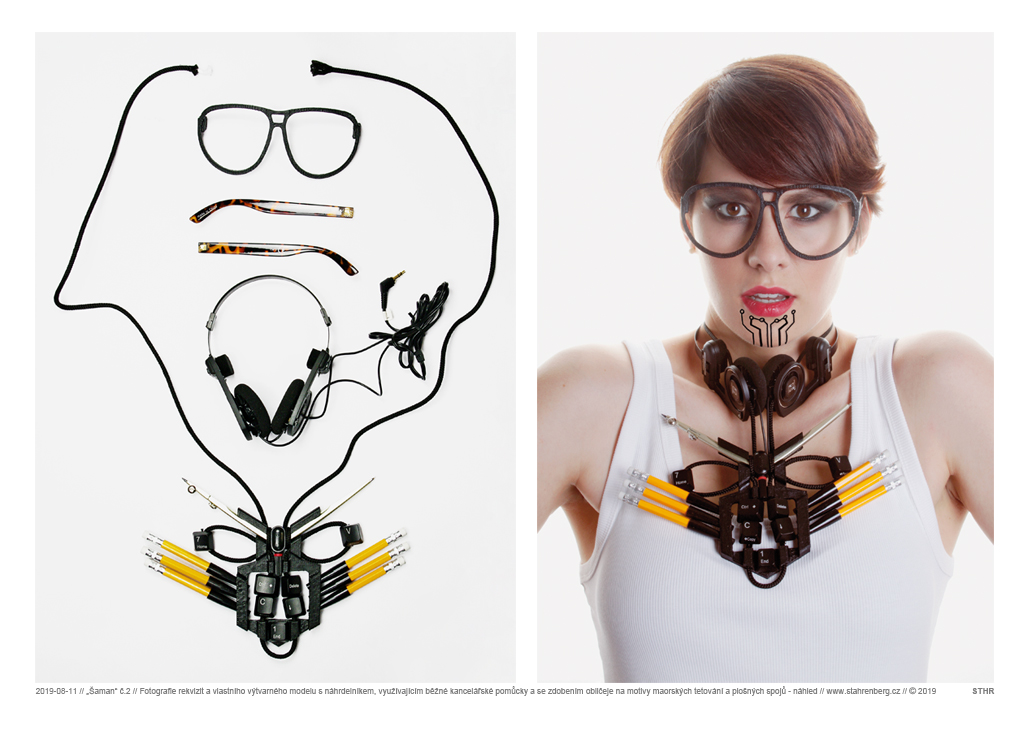 Výtvarný model s náhrdelníkem, využívajícím kancelářské pomůcky a zdobením obličeje na motivy maorských tetování a plošných spojů. Digitální fotoaparát Canon EOS 500D, objektiv: Canon EF 28-200 1:3.5-5.6 (druhý záložní). Zatím nedokončeno v plném rozlišení. |