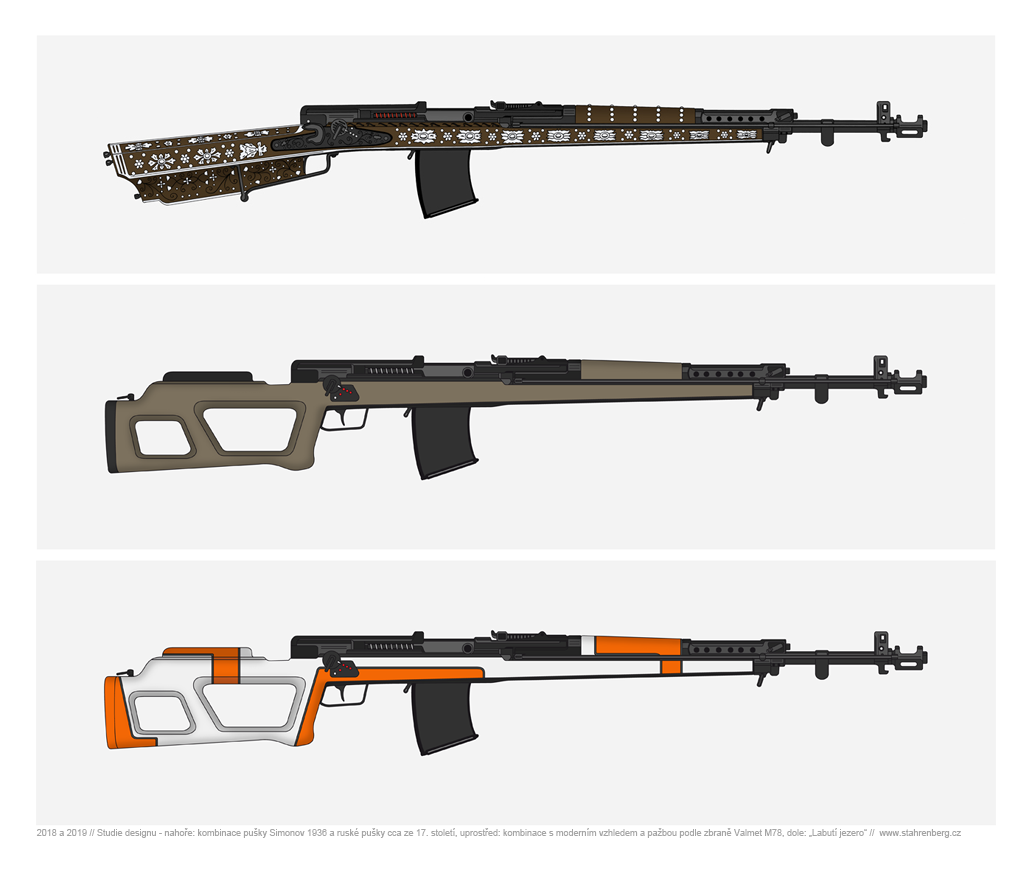 Studie, kombinující design zbraní napříč stoletími - sovětská automatická puška Simonov z roku 1936 (AVS-36) + zdobená ruská puška z 16. až 17. století (nahoře), uprostřed kombinace AVS-36 a pažby zbraně Valmet M78 finského výrobce + moderní, minimalistický design. Dole barevná kombinace "Labutí jezero", kdy zbraň tvoří spíše speciálně tvarované malířské plátno. |