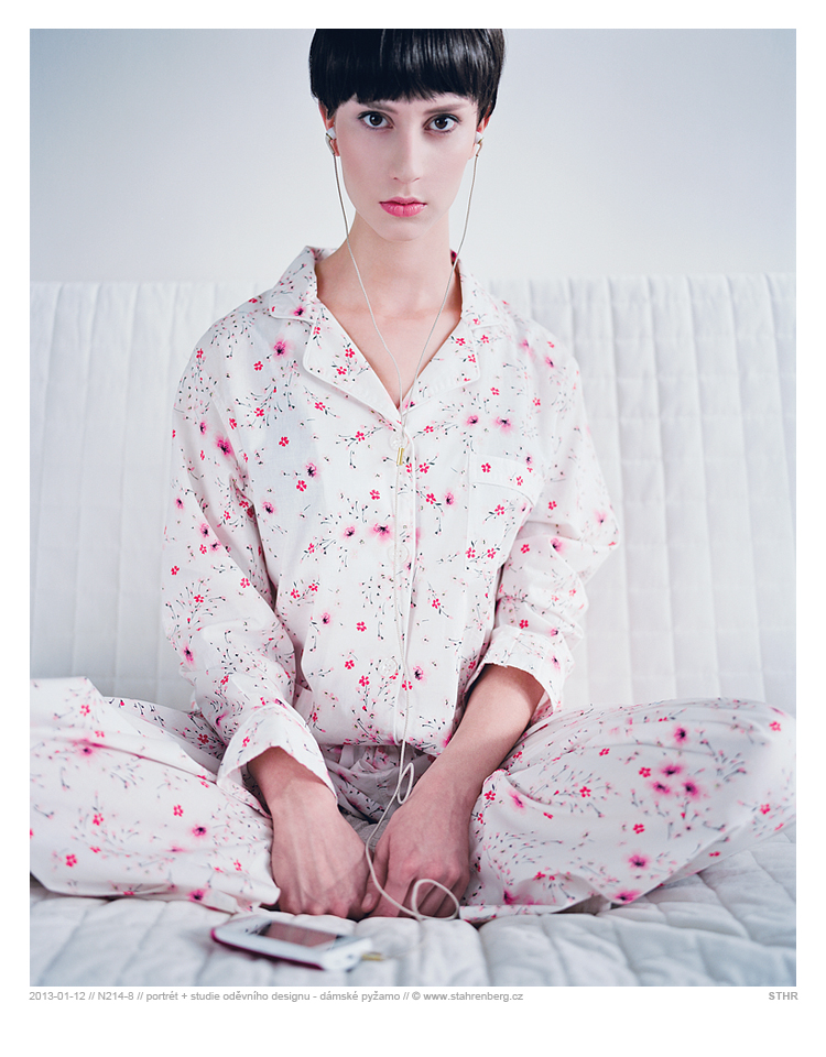 Portrét a studie oděvního designu (dámské pyžamo). Středoformátový fotoaparát Mamiya RB67 Pro SD, objektiv: Mamiya KL4.5/180L-A, materiál: Kodak. Sken a digitální úprava.