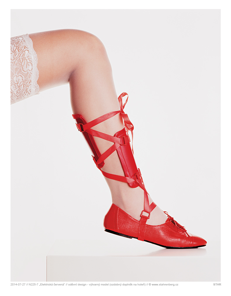 Oděvní design - modelový prototyp ozdobného doplňku na holeň a lýtko. Středoformátový fotoaparát Mamiya RB67 Pro SD, objektiv: Mamiya KL4.5/180L-A, materiál: Kodak. Sken a digitální úprava.
