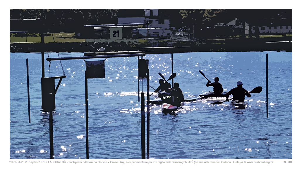 Fotografie, zachycující zvláštní jev odlesků slunce na vodní hladině. Aplikace digitálních, obrazových filtrů (se znalostí prací malíře Gordona Hunta). Časté zobrazování tohoto jevu (a obecně sympatická světelná složka japonské animace) mě zaujalo také v animovaném seriálu "Astro Boy" z roku 2004. Praha, Trojský kanál. |